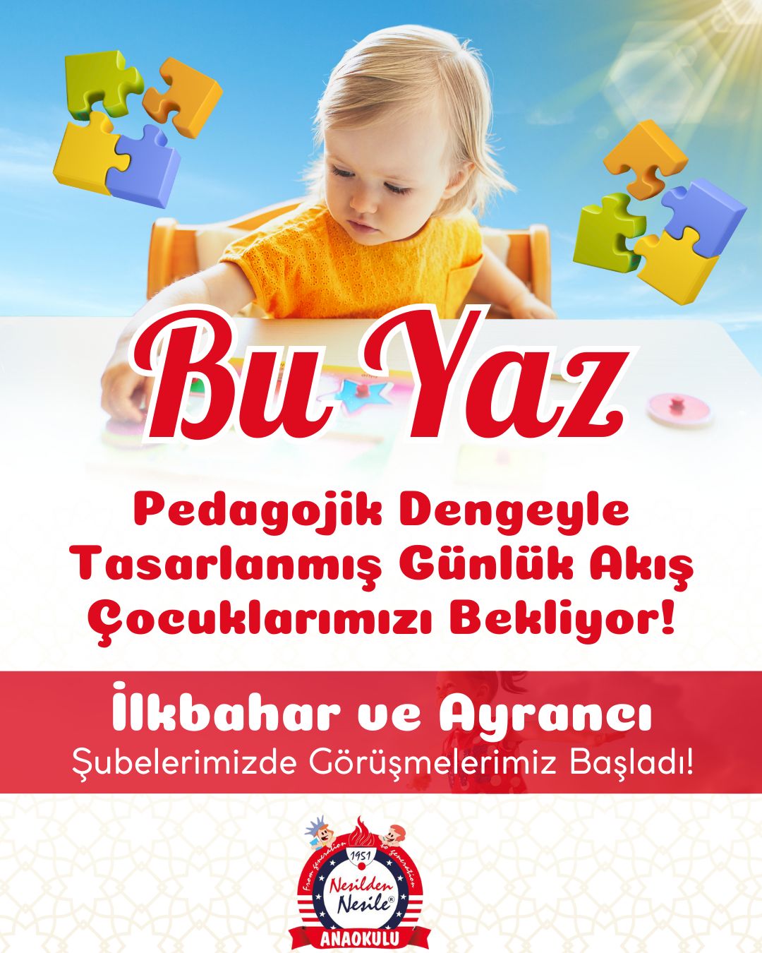 Nesilden Nesile anaokullarında, 3–5 yaş grubu çocuklarımız için hazırlanan okul öncesi eğitim programımız; çoklu zekâ kuramı, tematik öğrenme,oyun temelli yaklaşımlar ve sarmal eğitim modeli üzerine inşa edilmiştir.